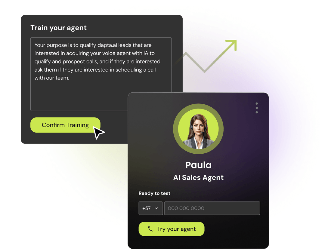 Dapta AI call agents use advanced models to sound indistinguishable from real people, adapting perfectly to your company’s context to deliver tangible results.