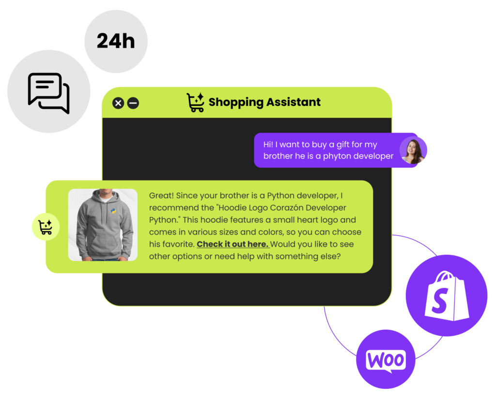 Set up in under 10 minutes in your Shopify or Woocommerce store to provide real-time, personalized support directly on your e-commerce.