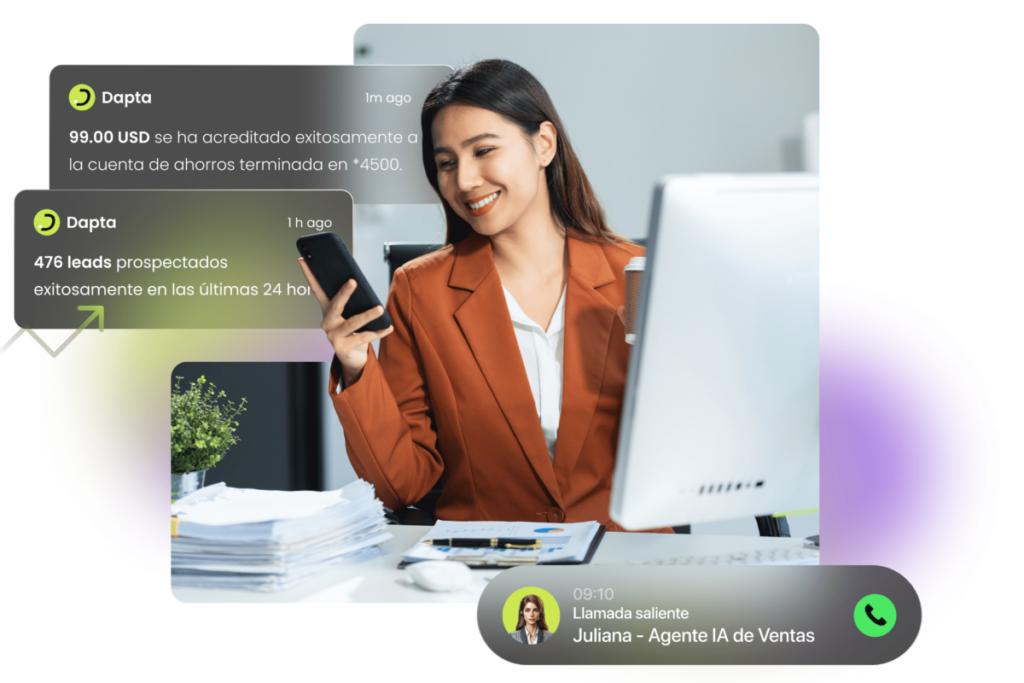 Dapta AI call agents use advanced models to sound indistinguishable from real people, adapting perfectly to your company’s context to deliver tangible results.